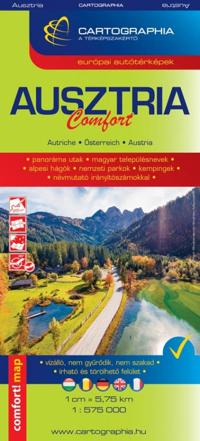A Cartographia kiadó népszerű Comfort térképsorozatának tagja 1:575000 méretarányban ábrázolja Ausztriát.