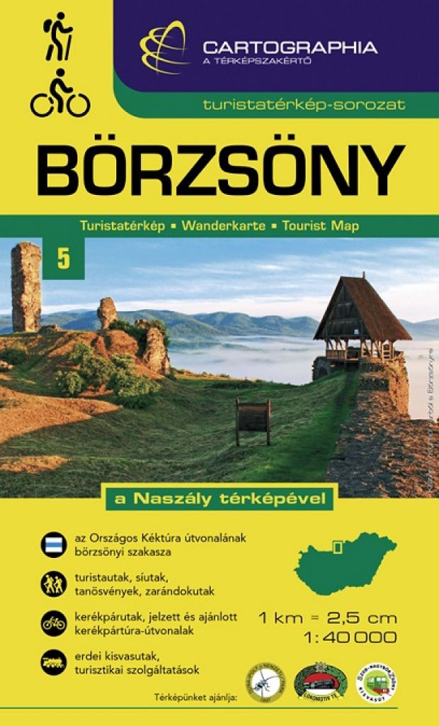 A Cartographia kiadó közkedvelt és közismert turistatérkép sorozata hazánk legfontosabb hegy- és dombvidékein vezet körbe és mutatja be e területek aktív turisztikai, elsősorban természetjáró lehetőségeit. Az aktualizált, új kiadású Börzsöny turistatérkép 1:40000 méretarányban részletesen és naprakészen ábrázolja a látnivalókat, a sokrétű szabadidős lehetőségeket, ezáltal nélkülözhetetlen társa az aktív turisztikai formák kedvelőinek.