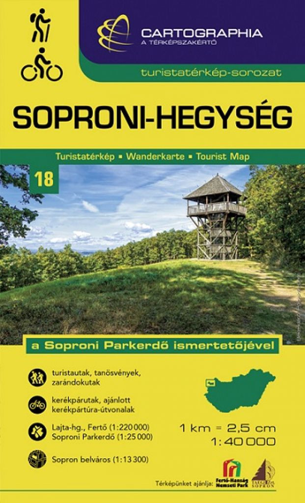 A Cartographia kiadó közkedvelt és közismert turistatérkép sorozata hazánk legfontosabb hegy- és dombvidékein vezet körbe, bemutatja e területek aktív turisztikai, elsősorban természetjáró lehetőségeit. Az aktualizált, új kiadású Soproni-hegység turistatérkép 1:40000 méretarányban részletesen és naprakészen ábrázolja a látnivalókat, a sokrétű szabadidős lehetőségeket, ezáltal nélkülözhetetlen társa az aktív turisztikai formák kedvelőinek.