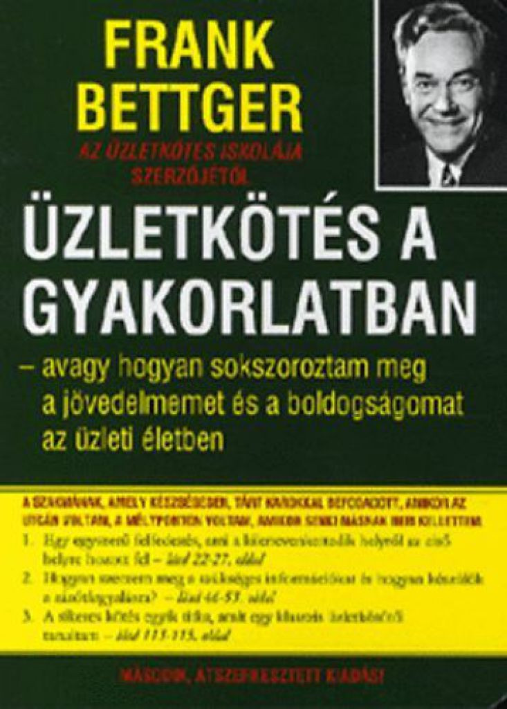Frank Bettger, aki huszonkilenc évesen még súlyos anyagi gondokkal küszködő, sikertelen ember volt, néhány év leforgása alatt Amerika egyik legeredményesebb biztosítási üzletkötőjévé vált. Mi a titka ennek a bámulatos sikernek? Az a módszeresség, ahogyan nagy példaképének, Benjamin Franklinnek tanácsaiból kiindulva nekilátott, hogy kiszűrje, tökéletesítse és következetesen alkalmazza a gyakorlatában bevált üzletkötési technikákat. Az Üzletkötés a gyakorlatban minden sorából érződik, hogy olyan ember írta, aki a "terepen" próbálta ki mindazt, amit követésre ajánl. Lépésről lépésre követi az üzletkötés menetét és a sikert eredményező technikákat. Bemutatja az önszervezésnek azt a módszerét, amellyel bárki kialakíthatja magában azokat a szokásokat, amelyek szakmájának kiváló mesterévé teszik - legyen bármi is ez a szakma.